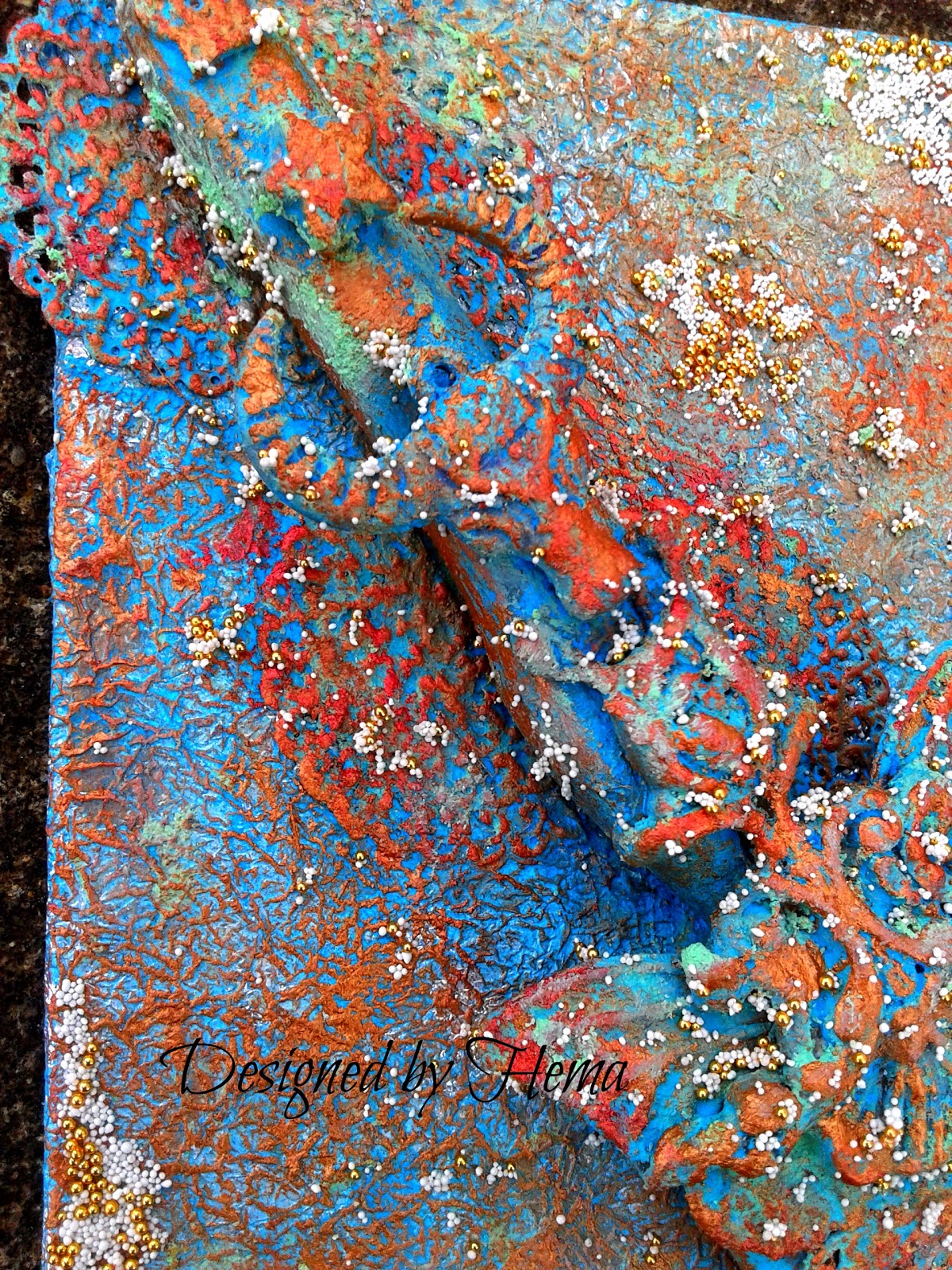 I have used kitchen foil as the background for texture, metal embellishments, Old brush, Clay mould from Prima, Art Stones, Patina Paste - Finnabair, wooden beads for corners, 3D heavy gel.